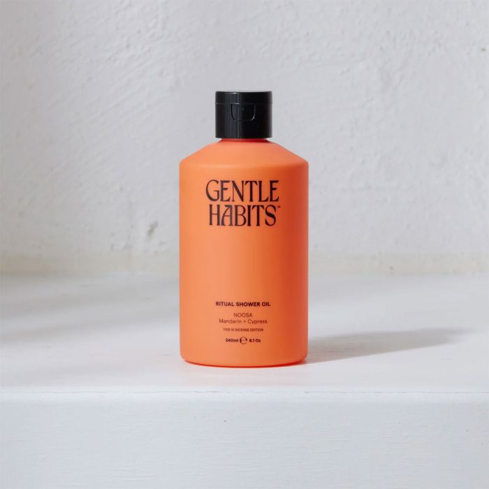 Gentle Habits' deeply hydrating Ritual Shower Oil harnesses the skin-replenishing power of Rosehip, Vitamin E, Lanolin, and blended essential oils to