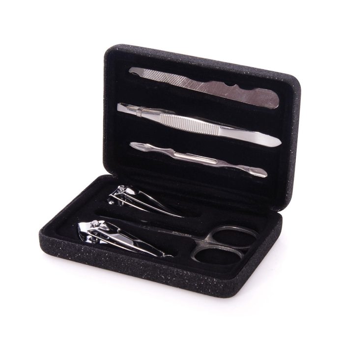 Hard shell case.6pc set: s/steel tweezers, cuticle pusher, scissors, nail file and 2 nail clippers.Size7.5x2.5x12cmAssorted colours, one will be chose