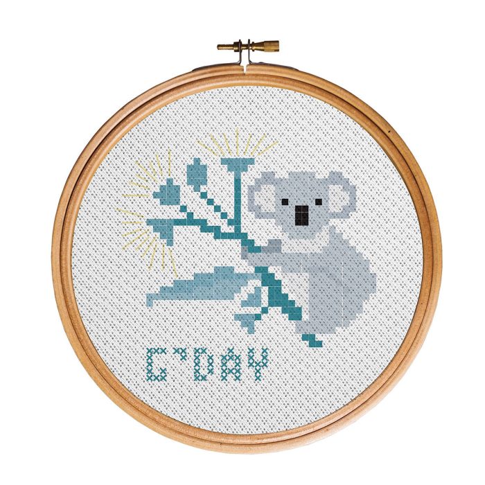 DIY kit includes 10cm Bamboo Hoop which doubles as a frame, aida cross stitch cloth, coloured thread, needle and full instructions.Create your own Aus