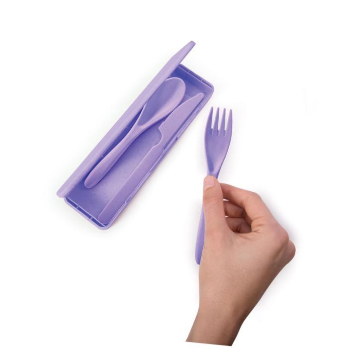 Eliminate single-use plastic cutlery with this wheat straw set.Knife, fork and spoon in a slim and compact travel case.Pop the