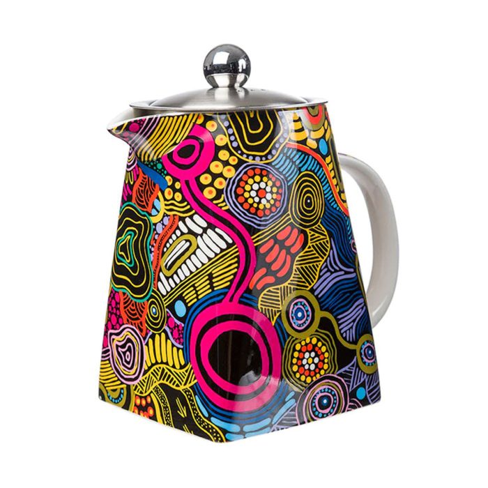 Fine Bone China Teapot with Strainer.Height (no lid): 13cmIdeal for 2 cups of tea.Based on artwork by Judy Napangardi Watson from Warlukurlangu Artist