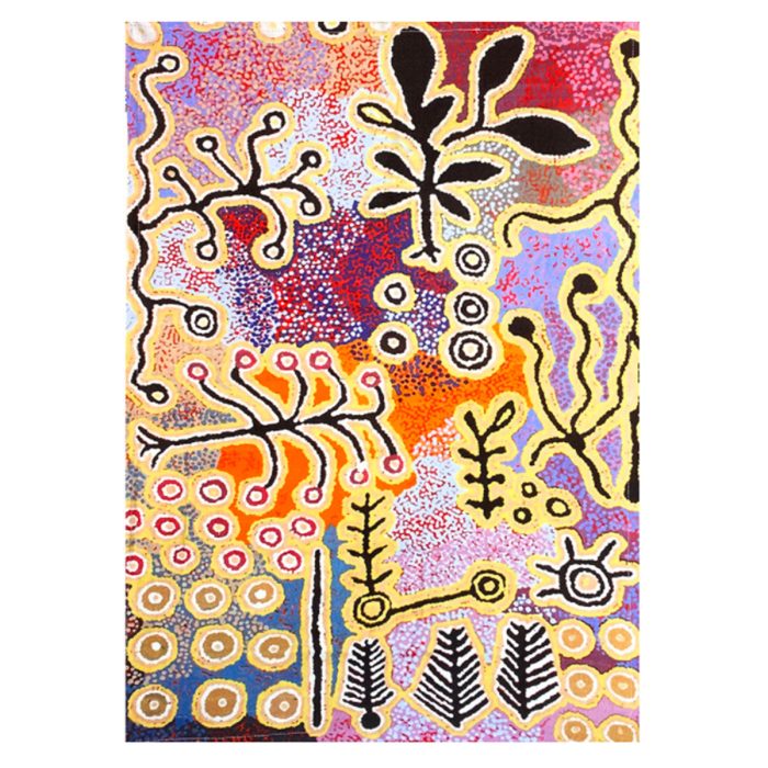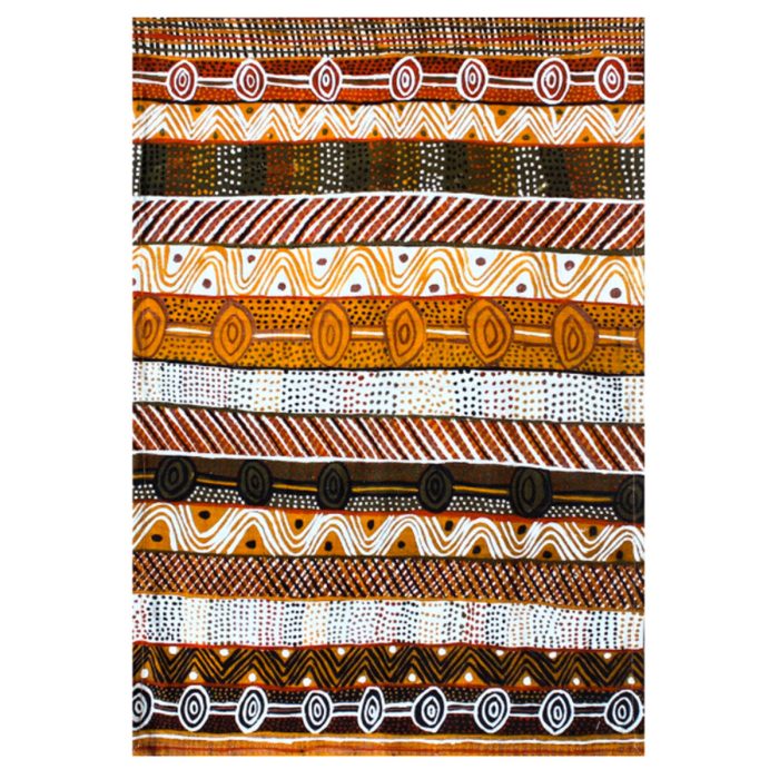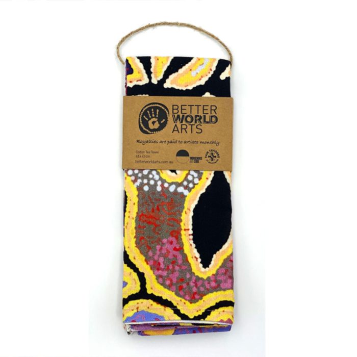 Cotton Tea Towel – Digital Print – 62.5cm x 42.5cm-PST604This painting shows the Yam and Bush Tomato Dreamings. You can see the Yams and the small rou