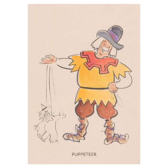 ‘Puppeteer’ postcard designed for National Museum of Australia’s Mr Squiggle and Friends exhibition.About the exhibition: Mr Squiggle and Friends: The Creative