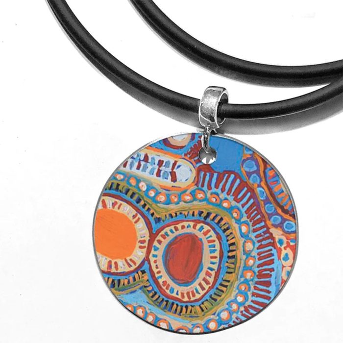 ARTIST Alma Nungarrayi GranitesPendant Round 35mm (Diameter) x .9mm (d) w/ 450mm rubber cord with Sterling Silver fittings .