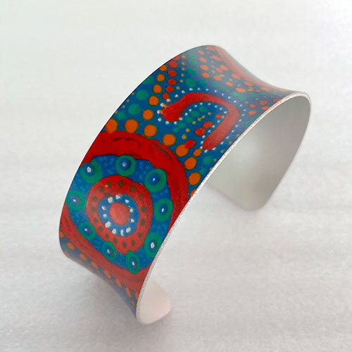 The bangles are made from 1mm thick and 25mm wide anodised aluminium. The bangles are medium in size with a diameter of approx 61mm and an opening of