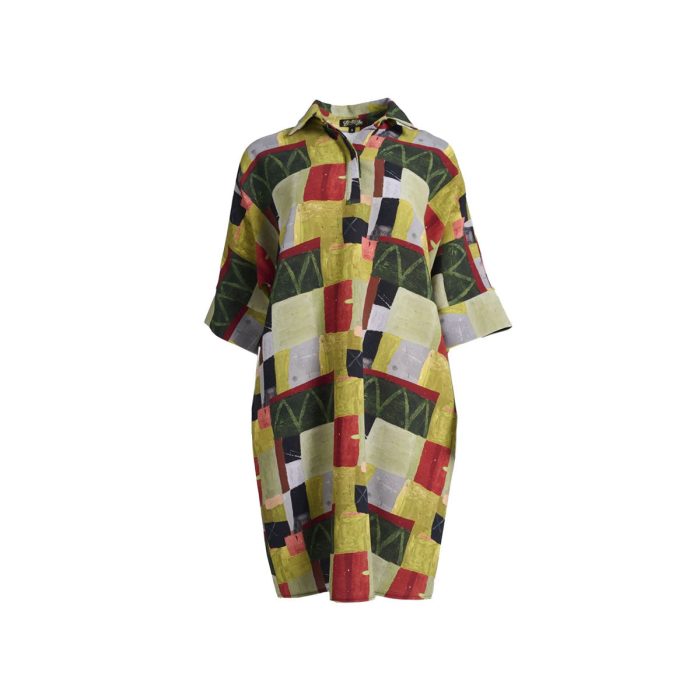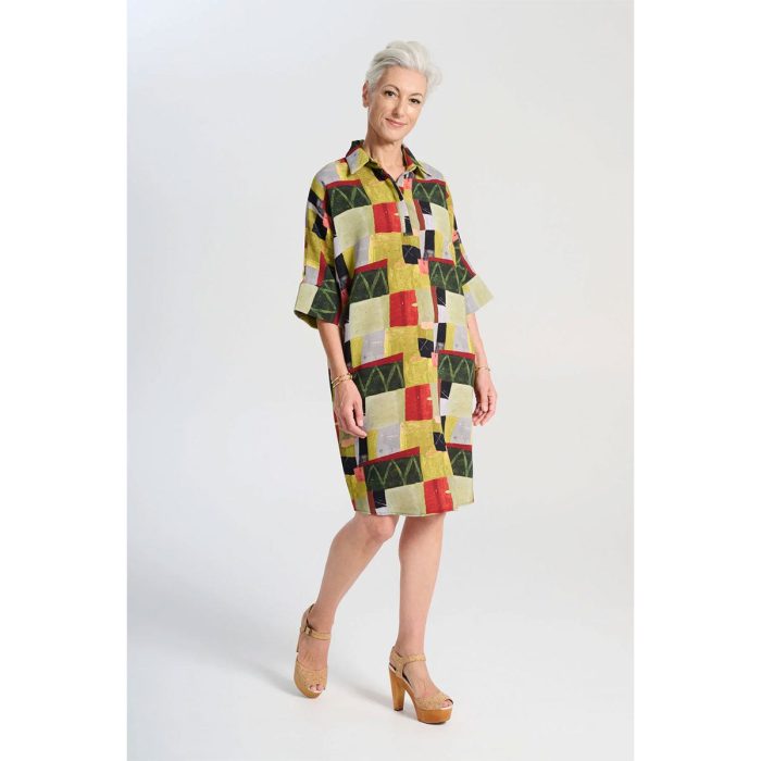 The Lato Dress showcases the vibrant Vaara print in a breathable French linen. A classic ELK shirt-dress style, featuring short batwing sleeves, class