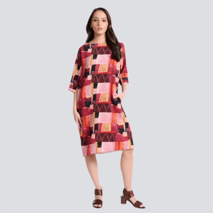 The relaxed shift silhouette ensures all-day comfort, while the half-length sleeves and crew neckline offer a modern, flattering fit. Perfect for both