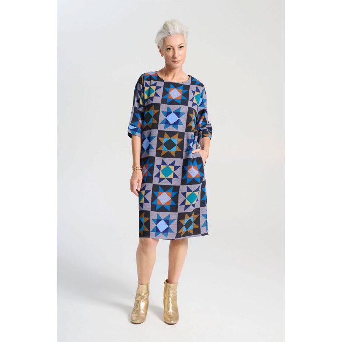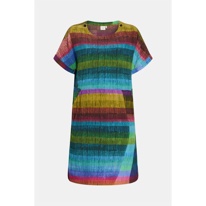The Sono Dress is a classic, short shift style tee dress in the vibrant multi coloured Komi Print. This easy-to-wear, slip-on, regular fit, day dress