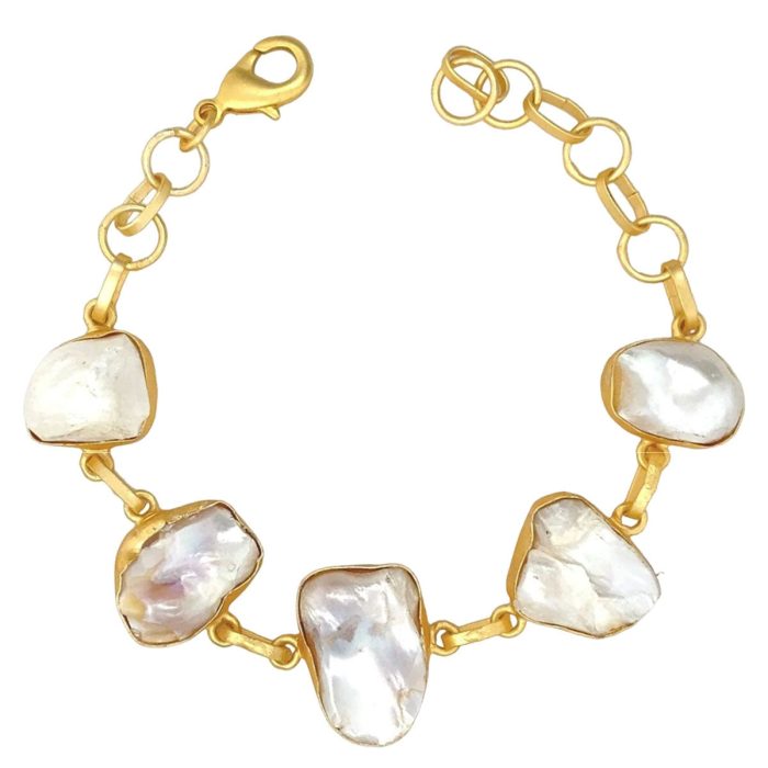 Nola Bracelet Plain (Pearl) #: 771791Stone: Baroque PearlMaterial: The base metal is brass and is gold-plated up to 14k.Handcrafted statement jeweller