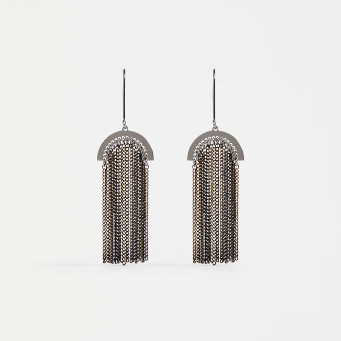 The Kade Hook Earring is all about movement. Columns of fine chain fringe dangle from a half-moon-shaped metal base, connected by jump rings. With eve