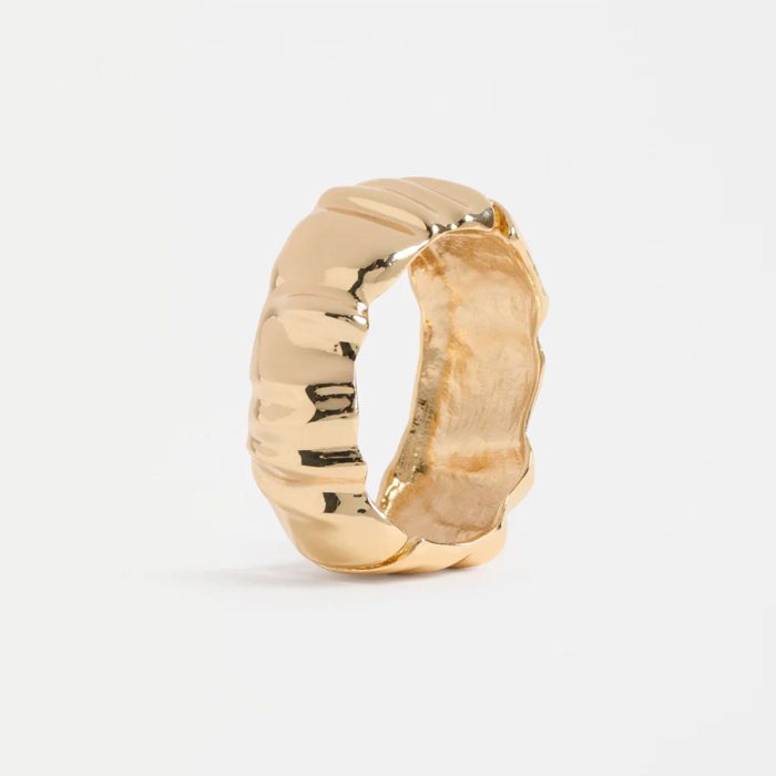 The Dalen Bangle showcases a luxe sculptural design with organic folds along its thick band in a shiny, metallic finish. This closed-end statement ban