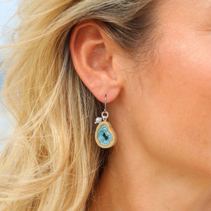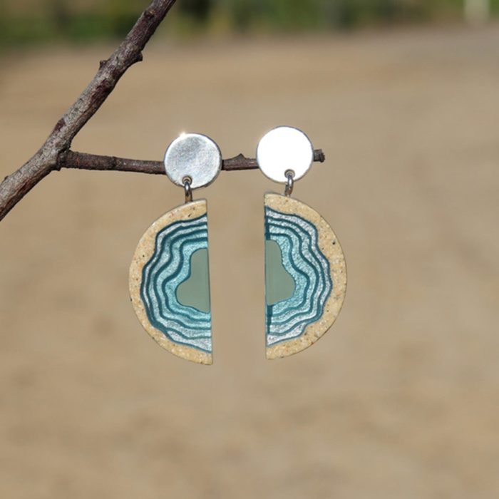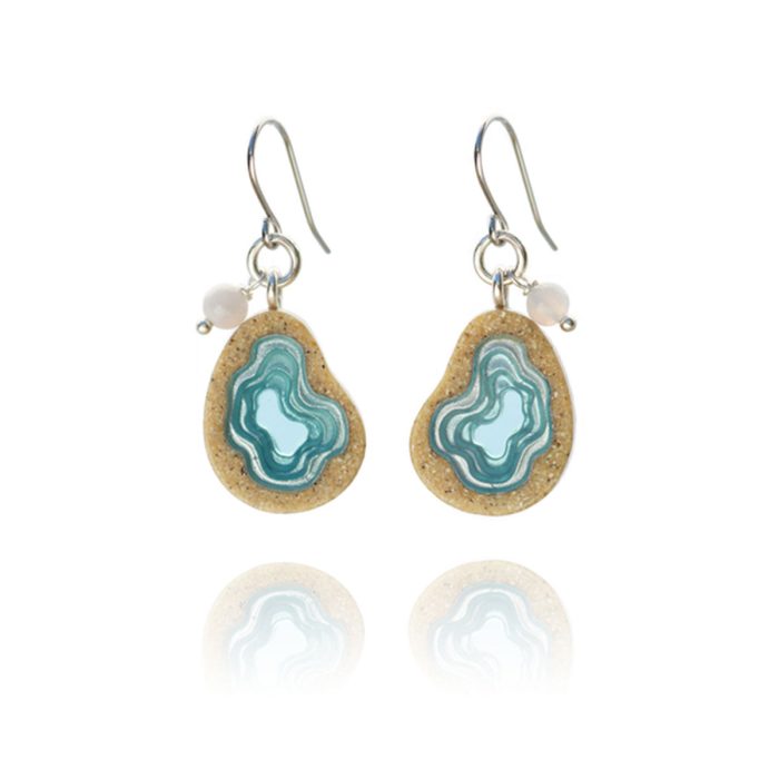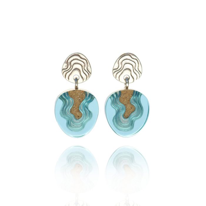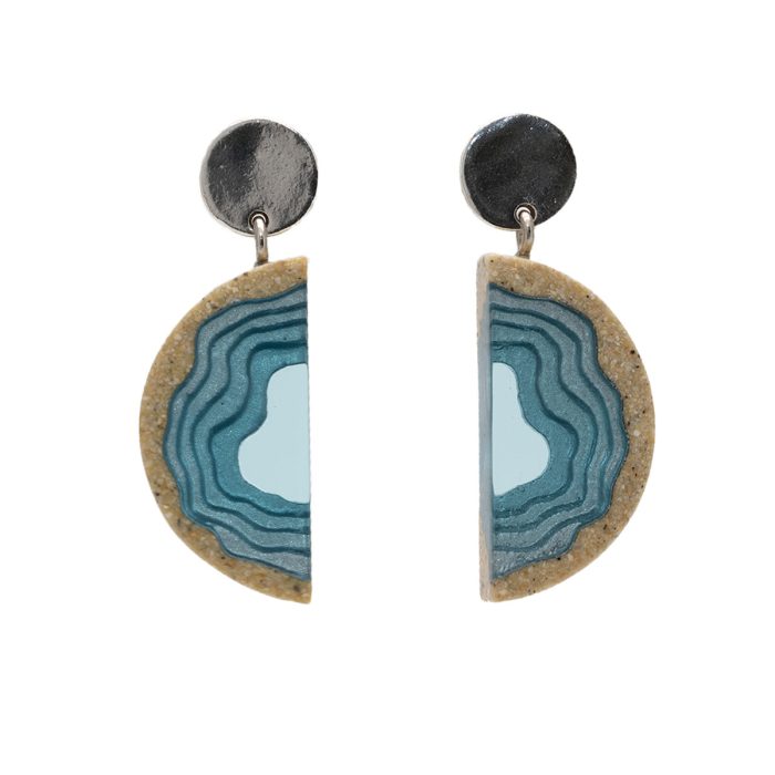 The Cape earrings are carefully crafted from bonded sand combined with blue resin, emulating the geographic shape of a cape protruding into the ocean.