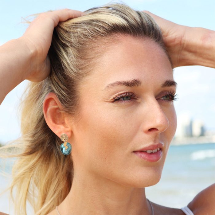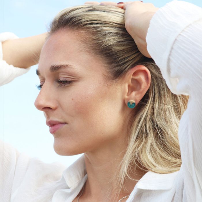 Our Shoal Stud earrings have been carefully handmade from bonded sand, aqua or ultramarine blue resin and metal pigments with a high-gloss polished fi