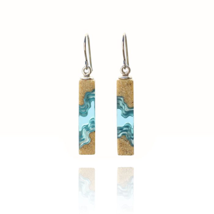 The Strait earrings showcase a minimalist, elongated rectangle shape. Crafted from bonded sand and blue resin, the design is inspired by a narrow stra