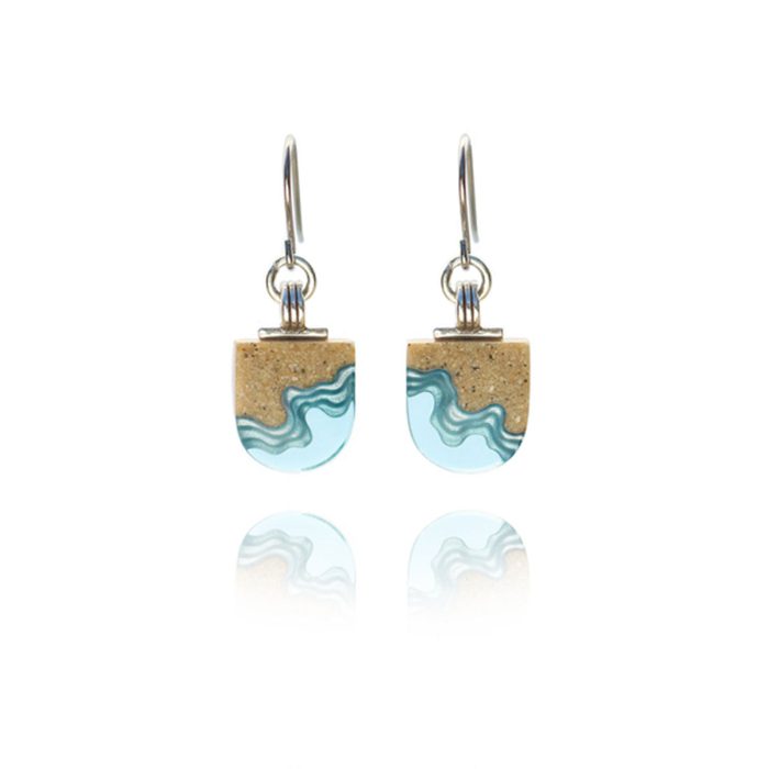 The dainty Shoreline earrings feature a U-shaped design crafted from bonded sand and blue resin, resembling the shore and ocean. The earrings dangle o