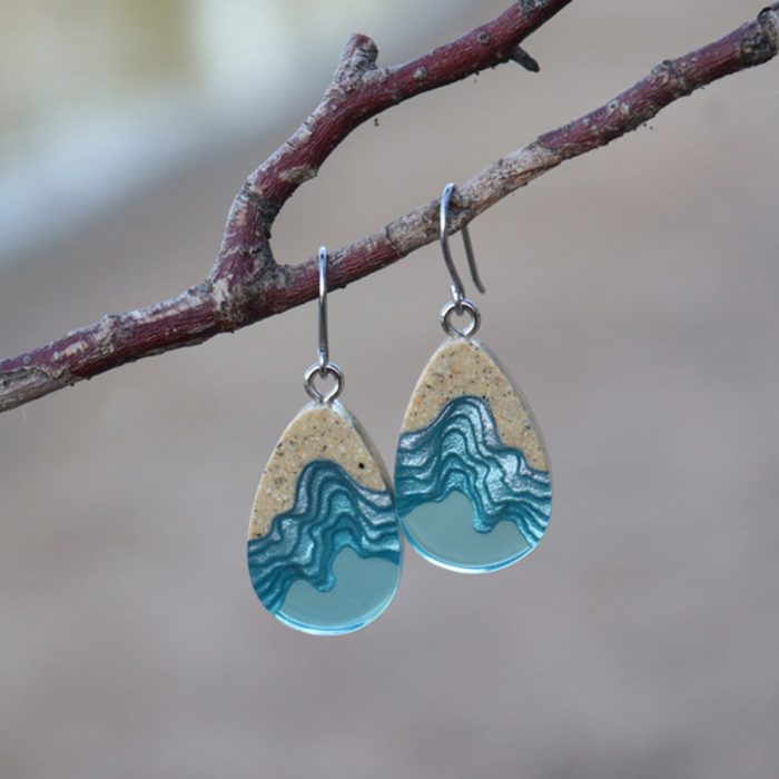 BoldB's Seashore Dangle Earrings have been carefully handmade from bonded beach sand, aqua or ultramarine blue resin and metal pigments with a high-gl