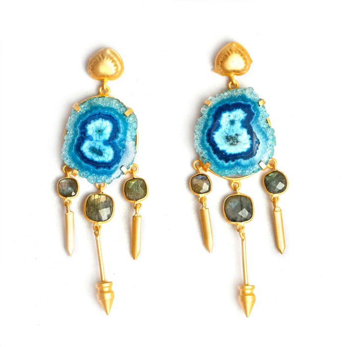 Syren (Blue Solar Quartz) Statement Earrings#772118Stone: Blue Solar QuartzMaterial: Brass is the base metal and gold plated up to 14kHandcrafted stat