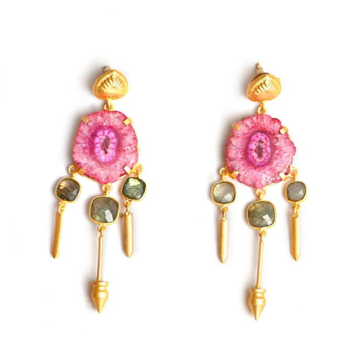 Syren (Pink Solar Quartz) Statement Earrings#772132Stone: Solar QuartzMaterial: Brass is the base metal and gold plated up to 14kHandcrafted statement