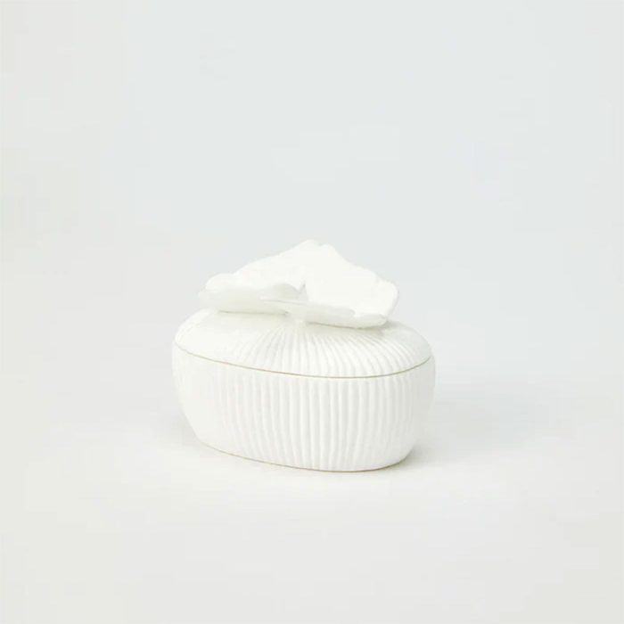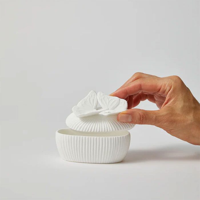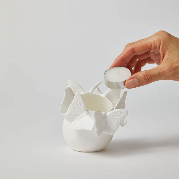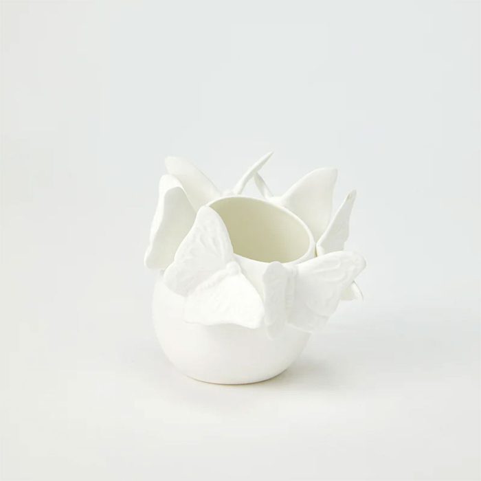 Our Monarch Votive is made from matte white bone china, adorned with delicate 3D monarch butterflies that seem to have alighted gently upon its surfac