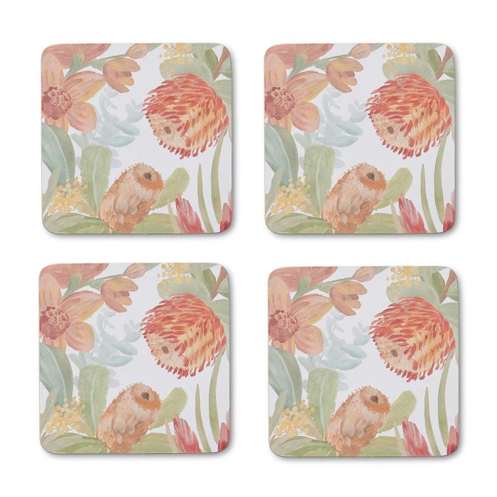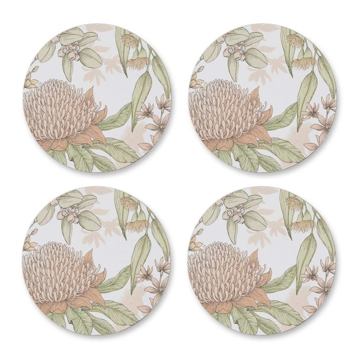 Native botanical print with blue background printed on a wipe-clean hard coaster.10x10cmCoated MDF with corkPackaged in a gift box