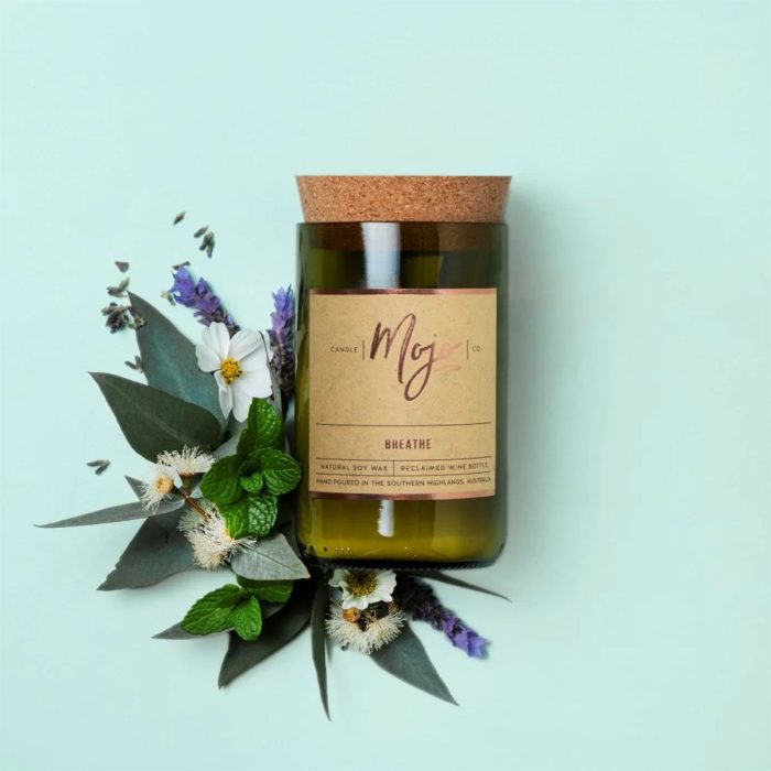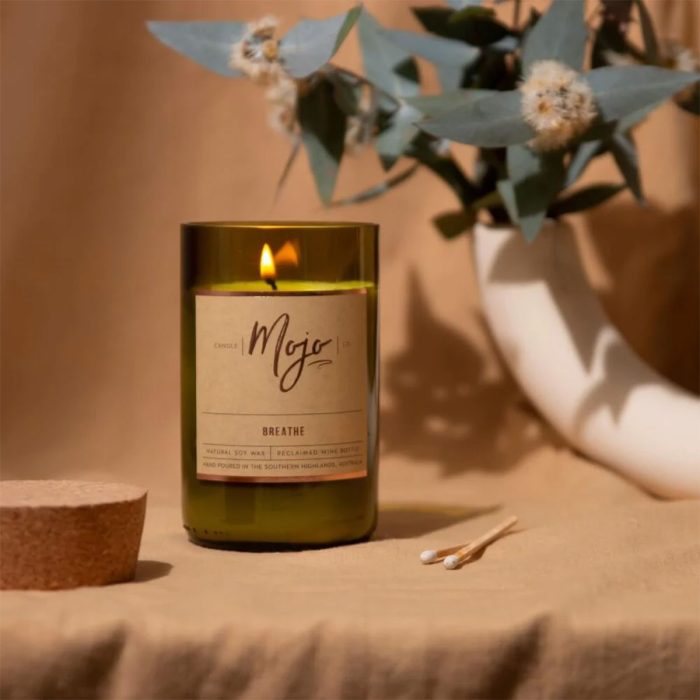 Breathe a little easier this winter with Mojo Candle Co's new Breathe candle, handpoured into their wide, cheeky-domed reclaimed wine bottles.With Win