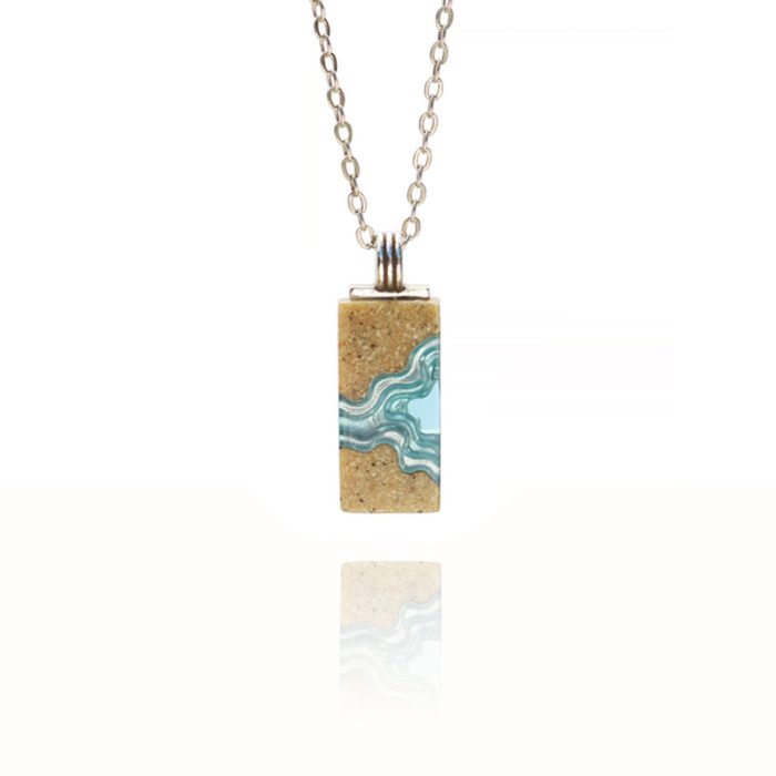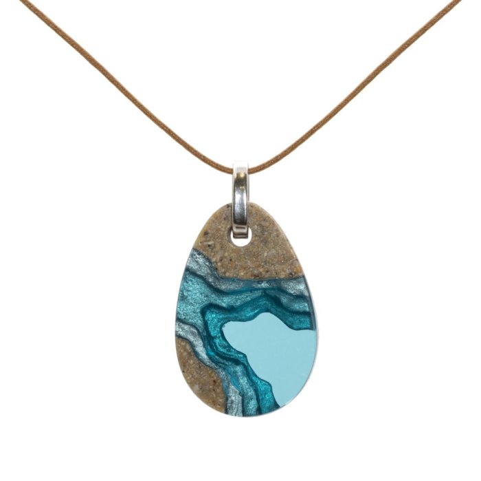 BoldB's small cove pendant has been carefully handmade from bonded beach sand, aqua blue resin and metal pigments with a high-gloss polished finish. A