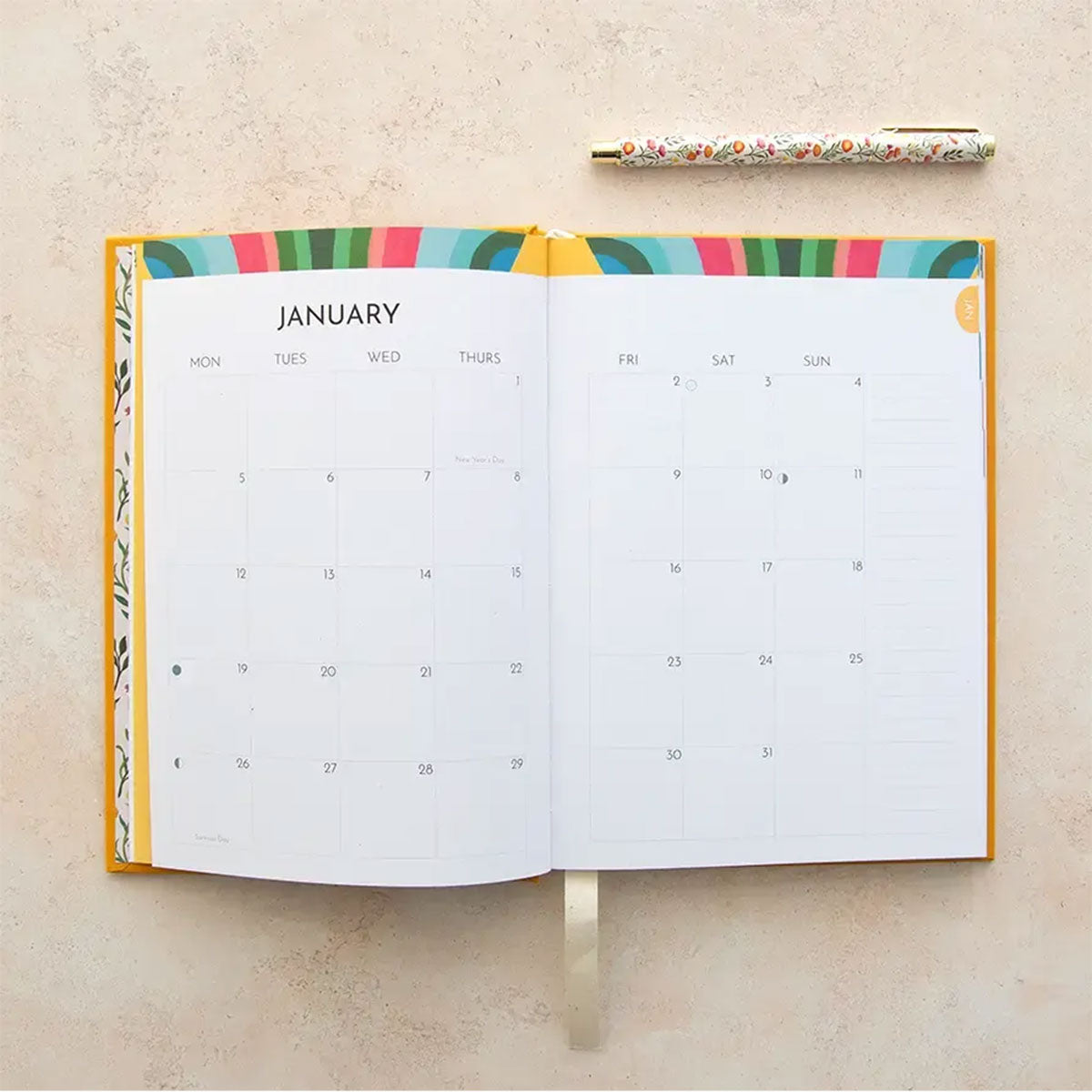 Yearly Overview – Your space to dream big and visualise your year! Here’s where you can record key events, and what’s most important to you.Monthly Focus – Create a focus for the month and set your goals. Outline the steps you’ll take to achieve them, and how it will make you feel when you get there.Monthly Calendar – View the whole month at a glance, making it easy to plan ahead.Weekly Spreads – Your space for everyday plans and to-dos, with equal space for weekends.Weekly Priorities & To-Do List – To keep you organised and on track.Weekly Gratitude Prompt – Practice gratitude to bring more positivity into your world.Habit Tracker – Work towards the habits you want, and ditch the ones you don’t.Free Space – Two extra lined pages each month, giving you freedom to add notes or personal touches.Quarterly Moon Phases – Helping you stay in touch with the cycle of life.