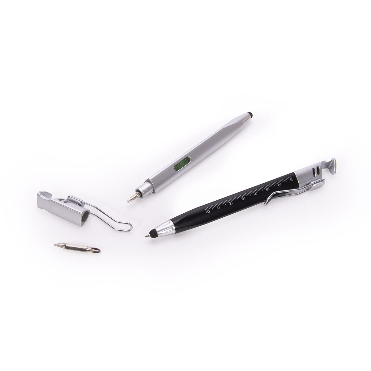 This handy ballpoint pen features a stylus, phone stand, pocket clip, 7cm ruler, spirit level, Phillips head & flat head screwdrivers. 8 x 1.3 x 1