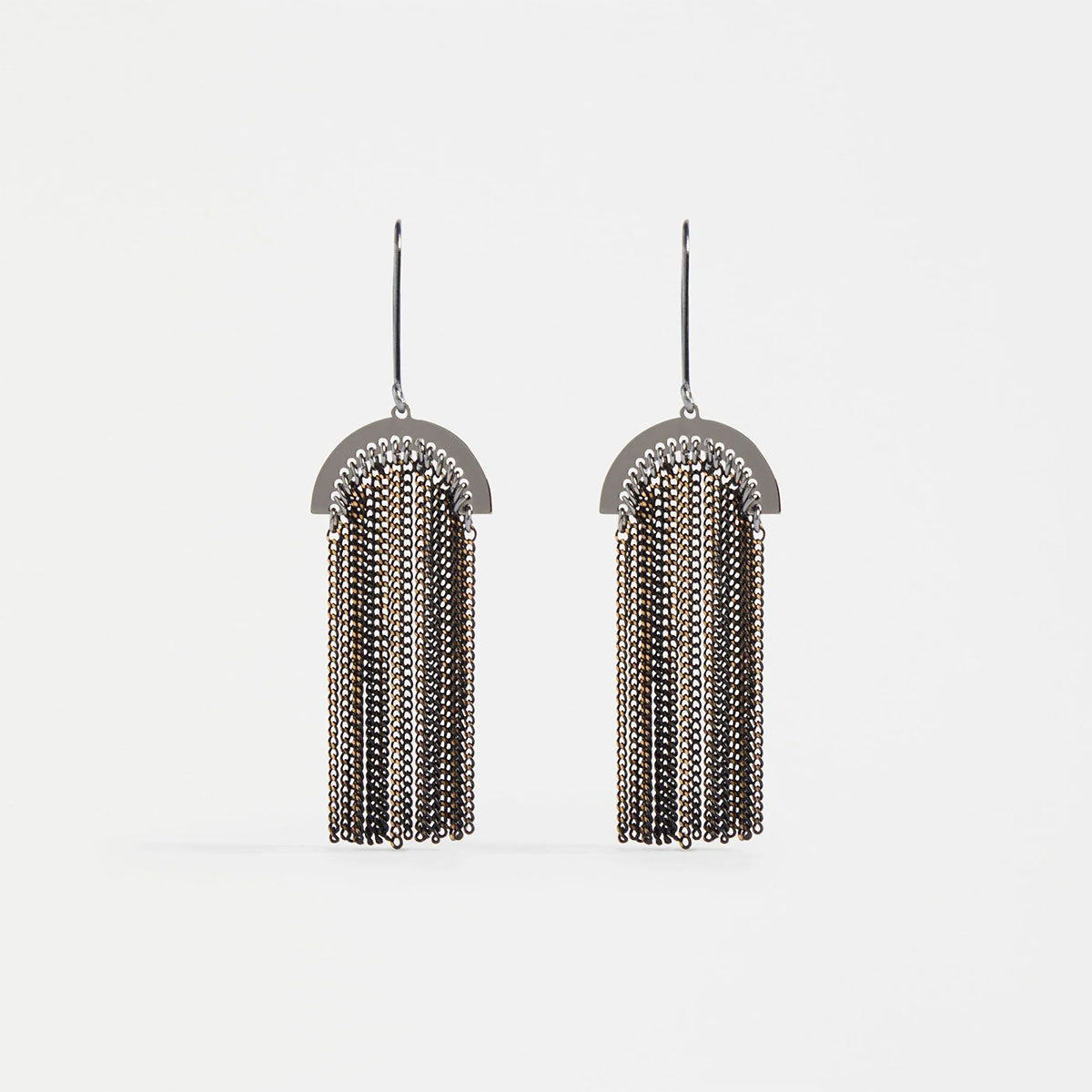 The Kade Hook Earring is all about movement. Columns of fine chain fringe dangle from a half-moon-shaped metal base, connected by jump rings. With eve