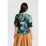 Cap sleeve top in multicoloured print.The Berg Top is a capped sleeve top with a wide collar stand. The top has a half placket with one concealed pres