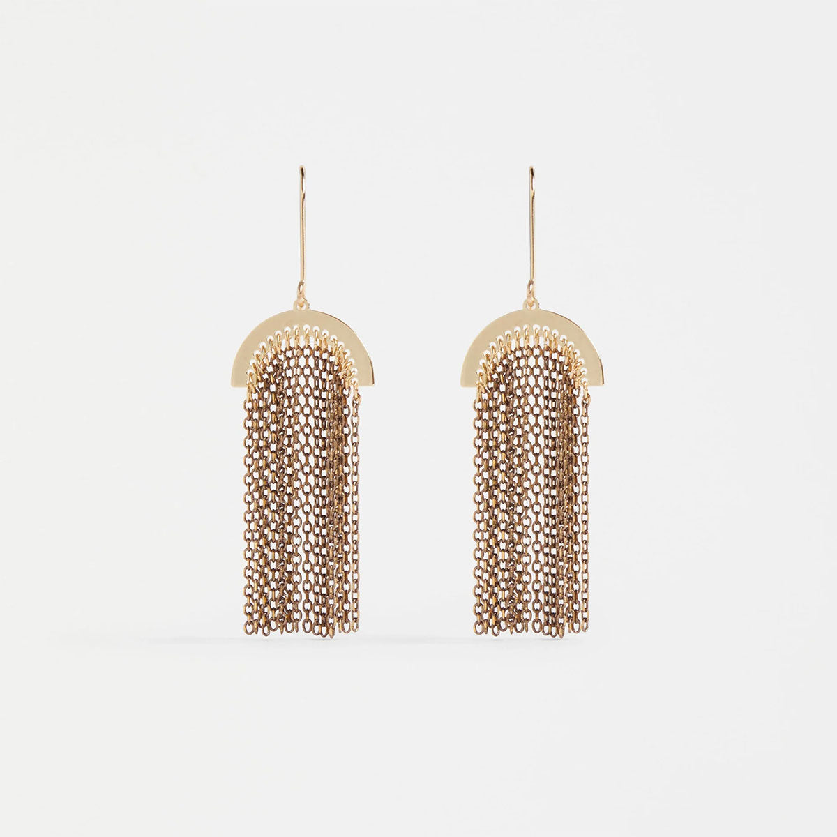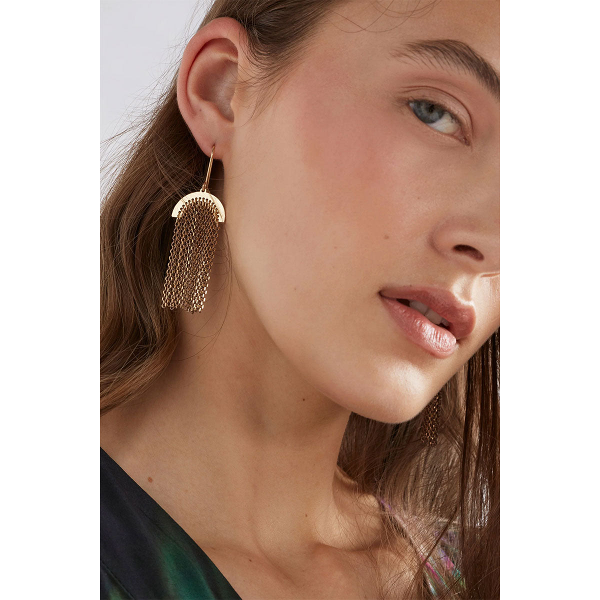 The Kade Hook Earring is all about movement. Columns of fine chain fringe dangle from a half-moon-shaped metal base, connected by jump rings. With eve