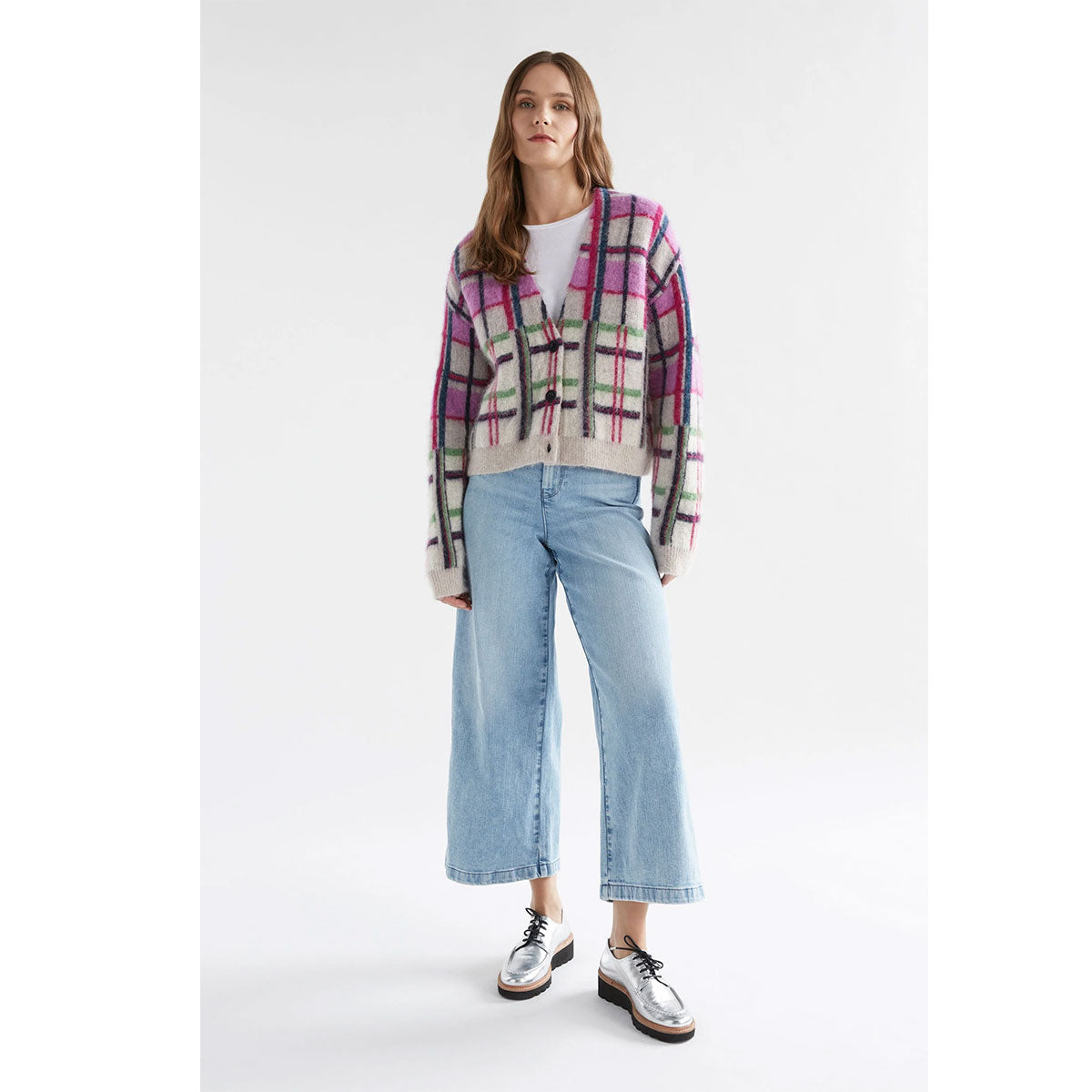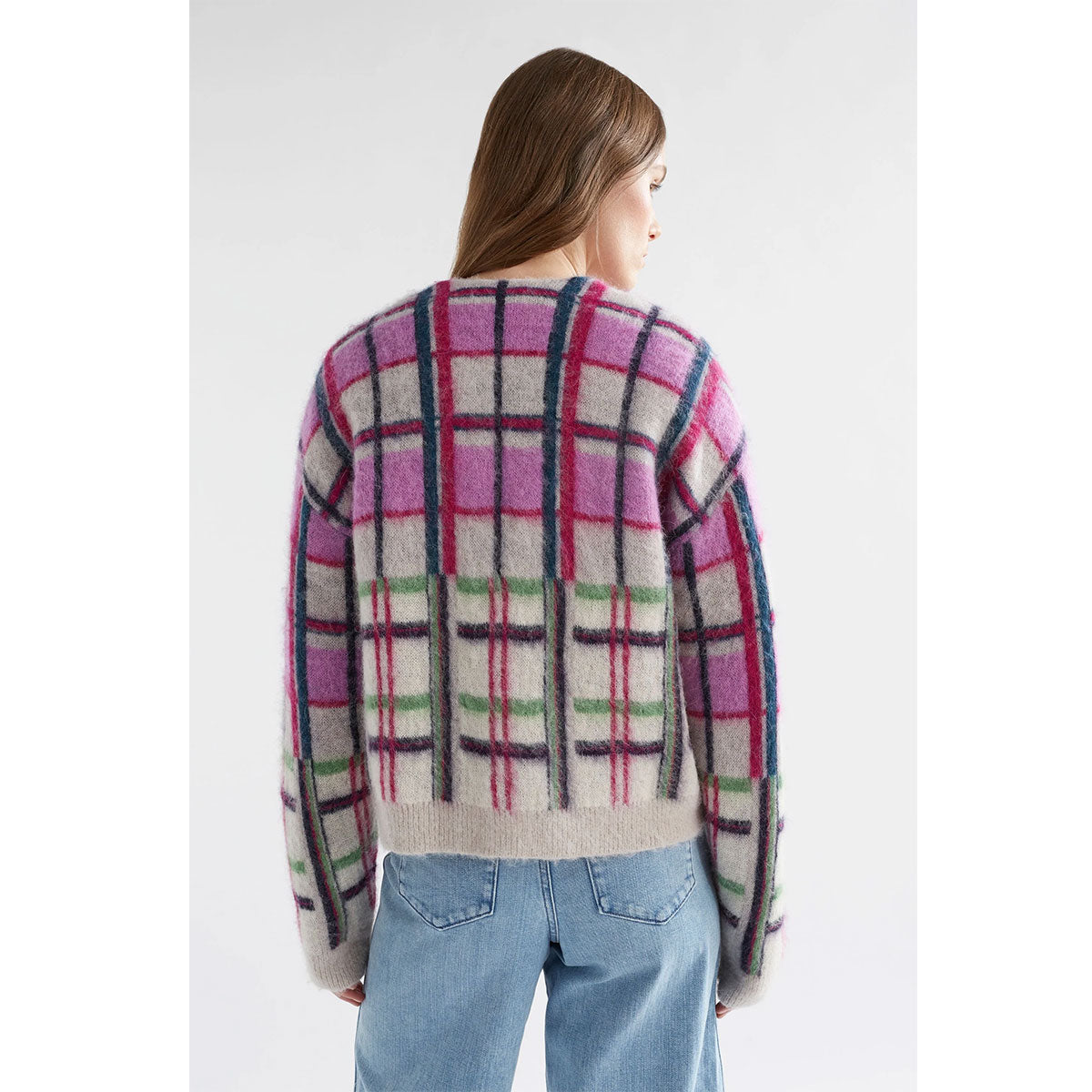 Bold jacquard check design in vibrant shades.Soft, fluffy alpaca, merino wool and recycled nylon blend.Relaxed, boxy fit for easy layering.Classic V-necklineNatural corozo nut buttons.