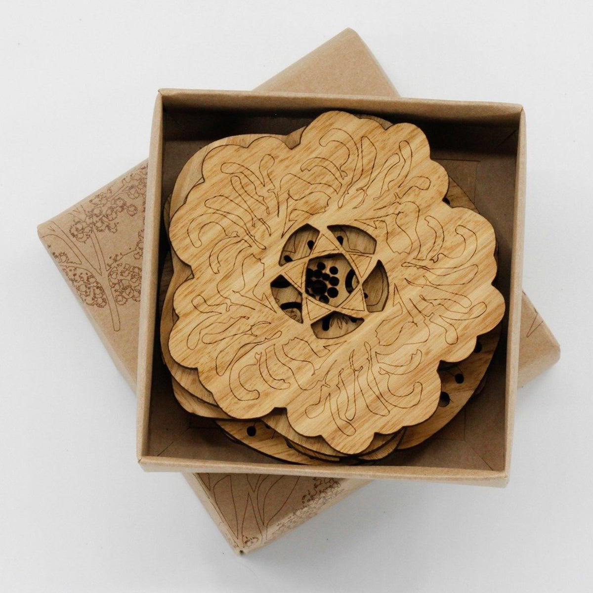 The Buttonworks sets of 6 coasters are packed in a recycled card gift box measuring 9.5 cm x 9.5 cm. We use a variety of Australian timbers in our range and all are sealed to resist staining. Each coaster set is made from sustainably sourced Australian timbers, and are available in Myrtle, Blackwood, Jarrah or Tasmanian Oak. Every tree is different, therefore the colour and grain of timber varies, making each of their products unique. The real work has been done by the tree, we have added the craftwork.