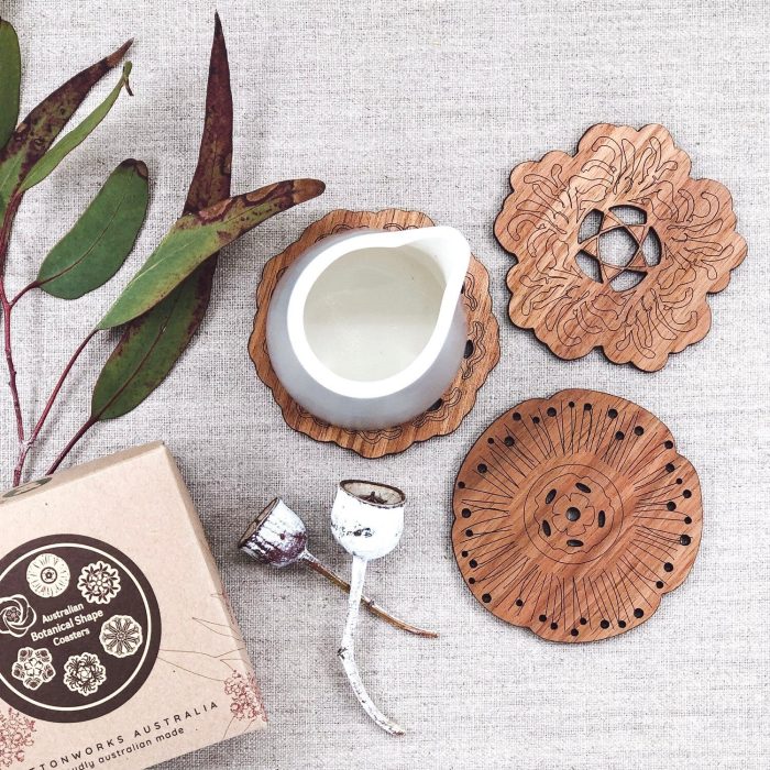 The Buttonworks sets of 6 coasters are packed in a recycled card gift box measuring 9.5 cm x 9.5 cm. We use a variety of Australian timbers in our ran