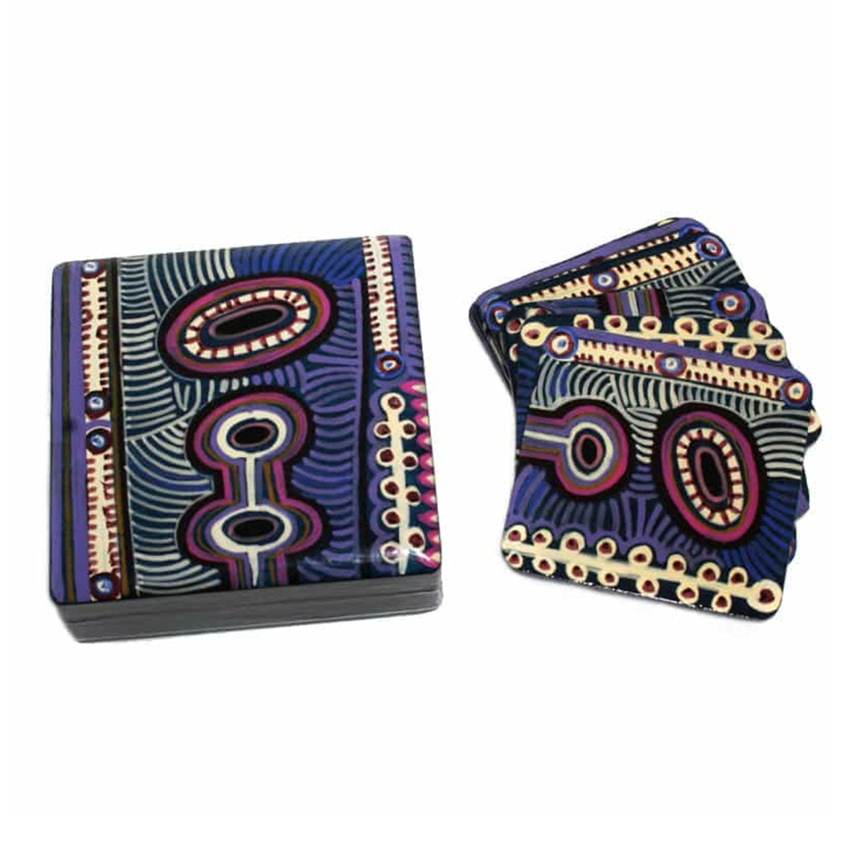 Coaster Set – 3.8x11x11cm-MNM649In this Dreaming story, two dog ancestors, a Jampijinpa and a Napangardi, travelled from the west to the east. At Tapu (a rockhole), the two dogs separated. The female dog, Napangardi, went to the south. The male dog, Jampijinpa, went to the north. Eventually he became lonely and howled for Napangardi in the south. She came running to him, and they married each other at Ngarnka. They wore men’s and women’s marriage headdresses, and Jampijinpa painted himself with white clay for the ceremony. The two dogs continued running east, before arriving in Warlaku (Ali Curung). Many other dogs were living in Warlaku when they arrived. There were many families of dogs, mothers and fathers and children and uncles all living together. Jampijinpa and Napangardi made a burrow to rest in and started a big family of dogs there. They chose to stay in Warlaku and live with all the other dogs. In this way, the ‘malikijarra Jukurrpa’ (two dogs Dreaming) tells the story of proper conduct in families and marriages.