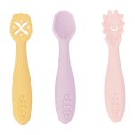 Learning how to use a spoon, fork or knife is tricky. The mini spoon set is perfect for learning to pick up food – these spoons are different styles to help your baby scoop, dip and grab. Soft silicone makes them chewable, and they are dishwasher safe. Packaging Size: 10cm x 16cm