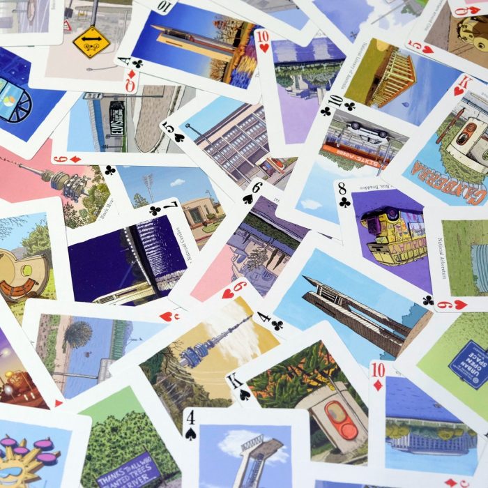 A pack of standard poker size playing cards containing 54 different drawings of Canberra printed on 300gsm linen finish art paper.