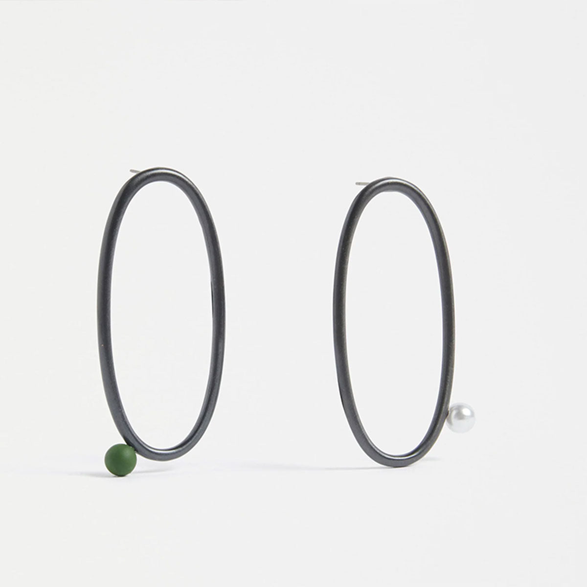 A bold departure from the ordinary, these earrings feature large brushed Gunmetal metallic ovals and asymmetric bead placements. The sleek drop design is where boldness meets softness, making them a striking yet approachable addition.