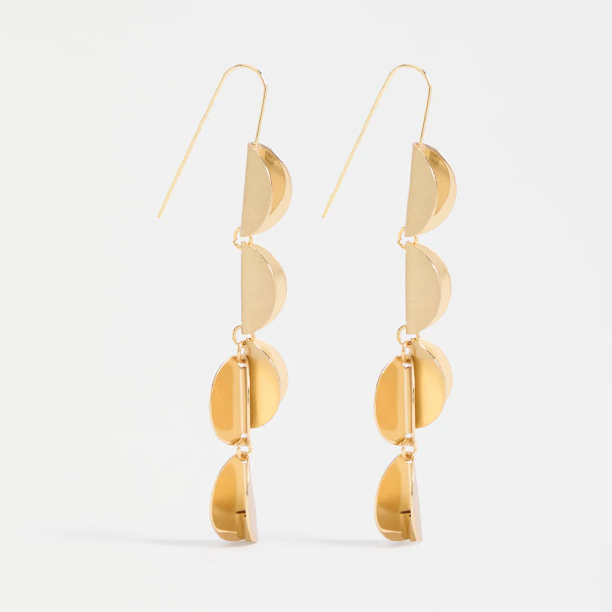 The Fossen Drop Earrings features a row of folded metal discs with a brushed exterior finish affixed to a hook earring. The discs layer on top of each