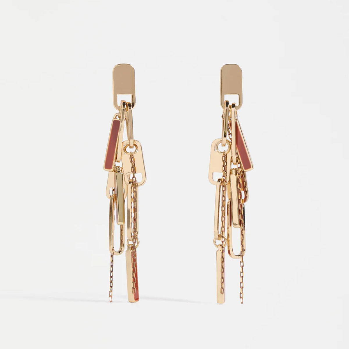 The Rymi Drop Earring showcase an eclectic mixture of links, chains and enamel bars in various sizes, creating a textural appeal. The varied elements,