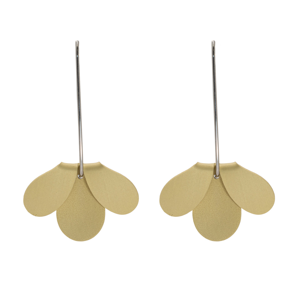 A collaborative project between Bronwen Riddiford and Robert Foster. Together they have created two new designs for hanging earrings: The first design is called ‘Propeller’ and is based on a symmetrical three pointed shape and the element of movement where two pieces spin on the hanging axis and the surface finish differentiates the two.