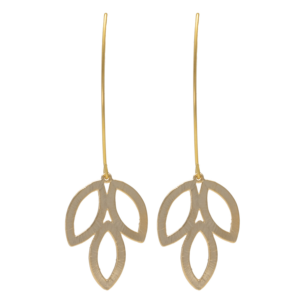 Gold plated triple leaves attached to matte gold plated hooksDimensions of leaves: 22mm x 31mm (not including hook)Designer Jewellery Blended with Uniqueness.