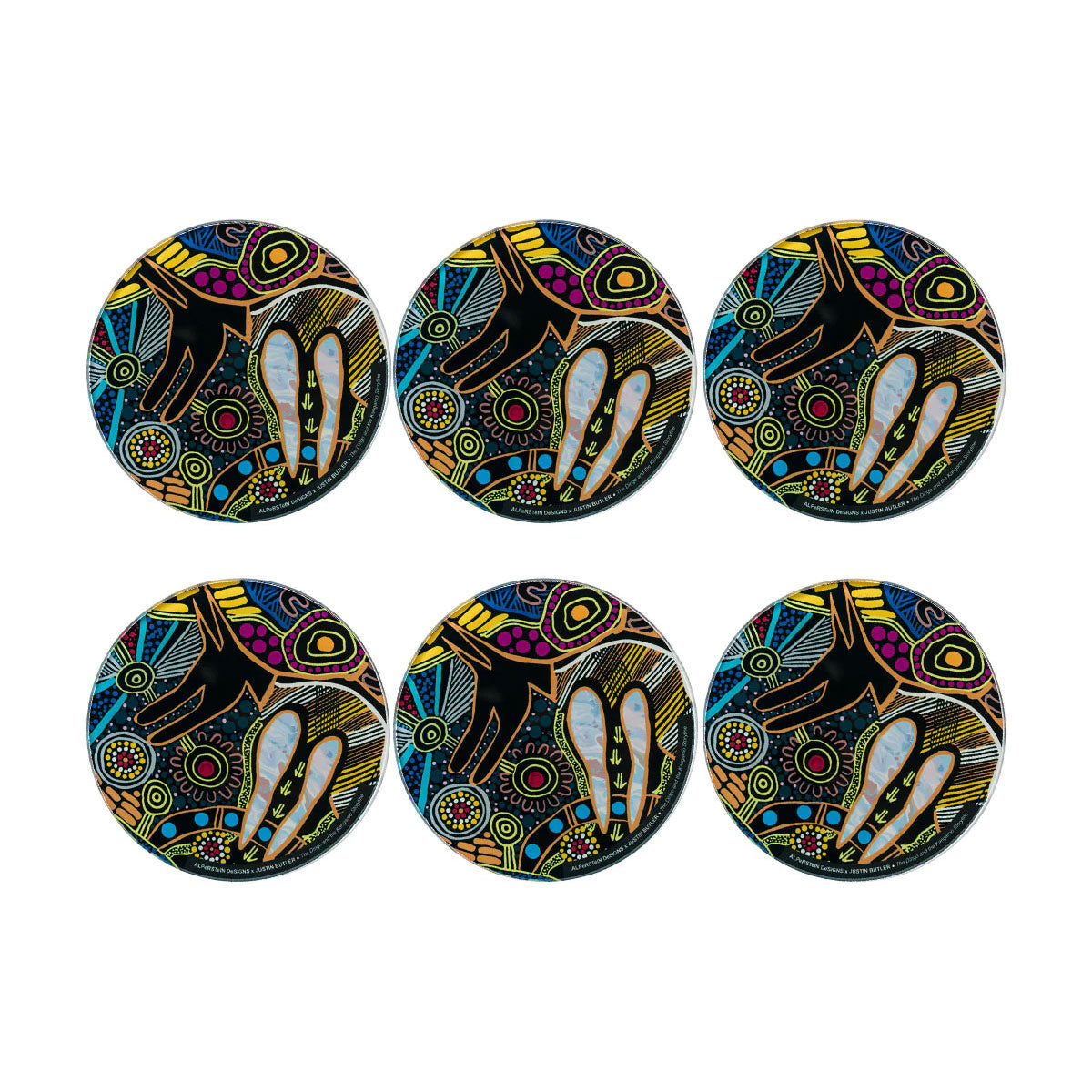 Make a lasting impression with this set of 6 Aboriginal Art glass coasters. The vibrant art design on the coasters is sure to brighten any home, and the included gift box makes this an ideal present. Give the gift of art today!Featured artwork: ‘The Dingo and Kangaroo Storyline’ by Justin Butler.Gift boxed – set of 6 glass coasters.Coaster Dimensions: 10cmIncludes information about artist and artwork.