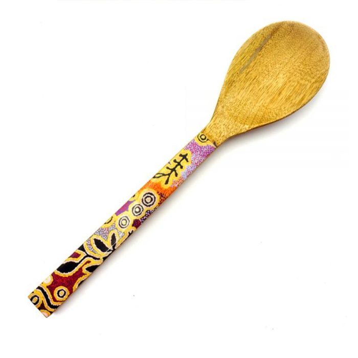 Serving Spoon – Wood-PST604This painting shows the Yam and Bush Tomato Dreamings. You can see the Yams and the small round berries of the Bush Tomatoe
