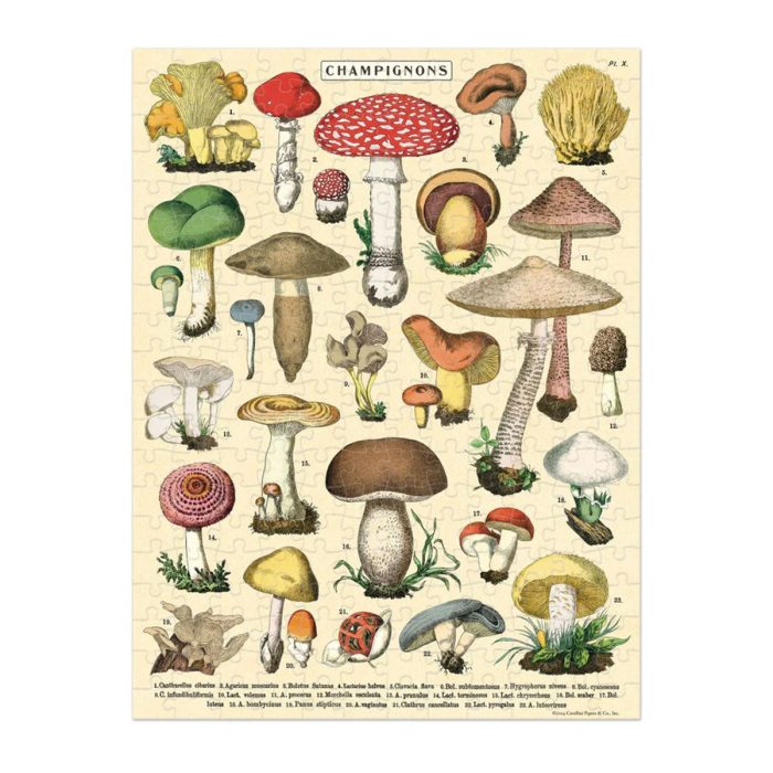 The Cavallini 240-Piece Mini Puzzle – Mushrooms brings the fascinating world of fungi to life with beautifully detailed vintage botanical illustration