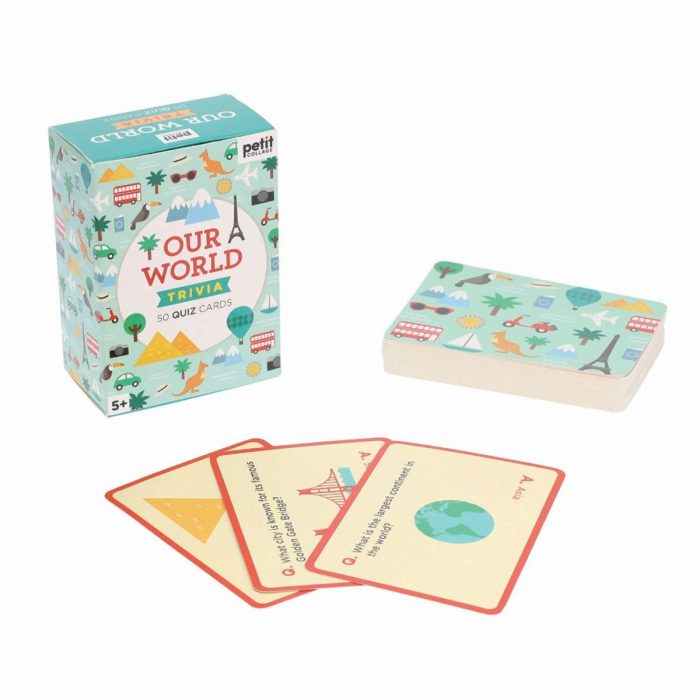 Expand your little globetrotter’s knowledge of this great big world with this Our World Trivia Quiz Card set from Petit Collage.Start educating your little one about places all over the globe by going through 50 question (and answer!) cards with them like