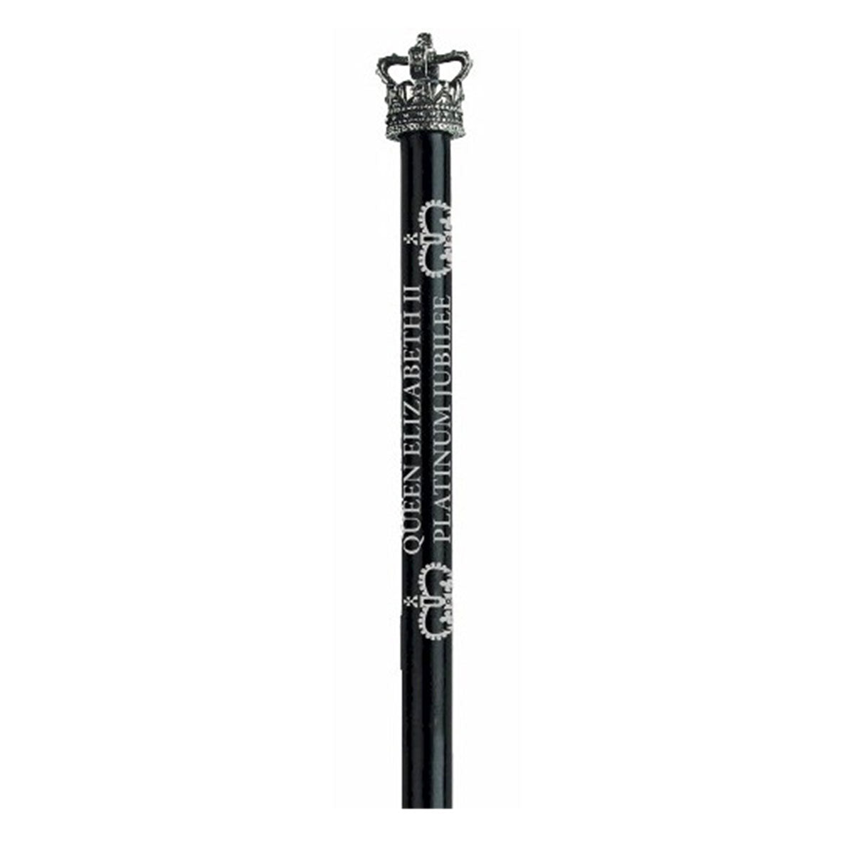 A pewter crown mounted on top of a black pencil with Queen Elizabeth II Platinum Jubilee 1952 – 2022 printed on it.