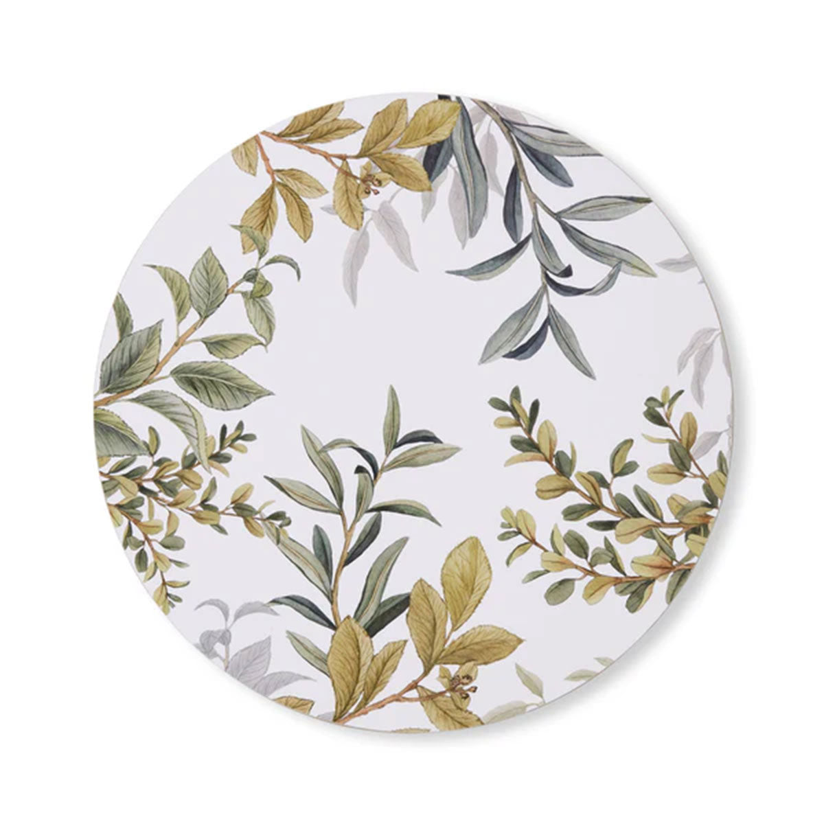 Foliage print with white background printed on a wipe-clean hard placemat.33x33cmCoated MDF with corkPackaged in a gift box