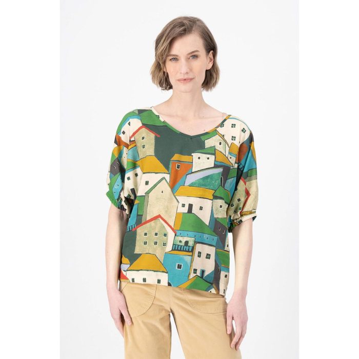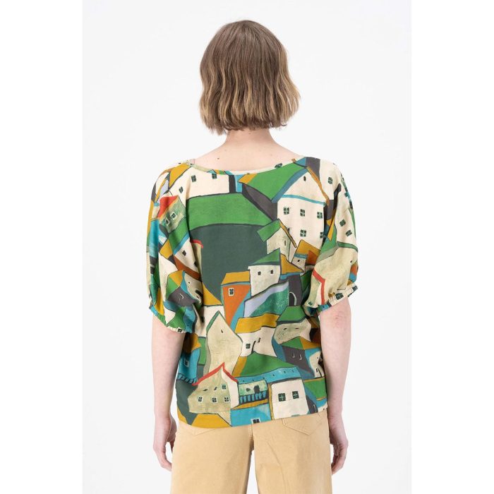 Print: Pueblito Green100% Tencel fabricSoft V-neckline / reversible boatneckBatwing shapeTapers in at the hipHip lengthSleeve cuff with slight elastic stretchModel is 181cm tall and is wearing an XSModel is a size 10. Bust: 89cm | Waist: 79cm | Hips: 99cm
