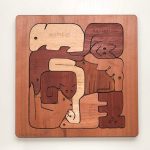 Animals made of varying timbers, creating an effective contrast of colours. Light weight and arrives flat packed for easy postage, (size 12cm x 12cm).